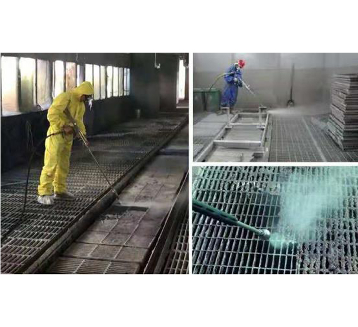 涂裝車間噴漆室中在格柵板、滑撬等處會(huì)殘留油漆,并不斷積累加厚。需要定期進(jìn)行清理,否則會(huì)影響生產(chǎn)及產(chǎn)品質(zhì)量。傳統(tǒng)的脫漆劑、人工刀鏟、火燒等除漆方法不僅后續(xù)處理成本高、效率低下,而且還會(huì)造成工件的損傷變形以及作業(yè)環(huán)境的空氣污染。使用高壓水清洗設(shè)備不僅能大大提高清洗速度、去除油漆等污物,還保護(hù)了作業(yè)環(huán)境